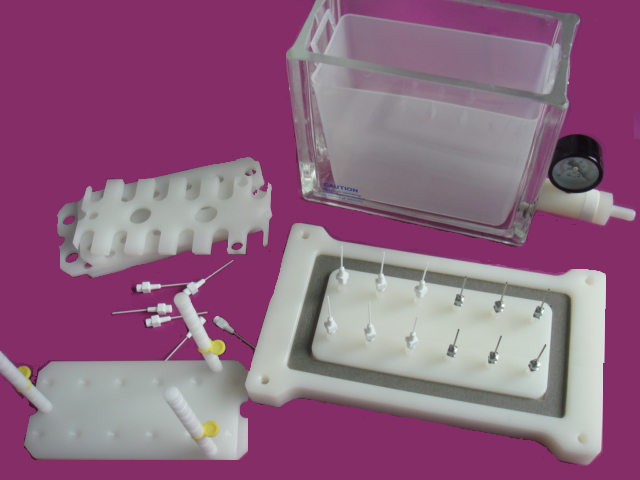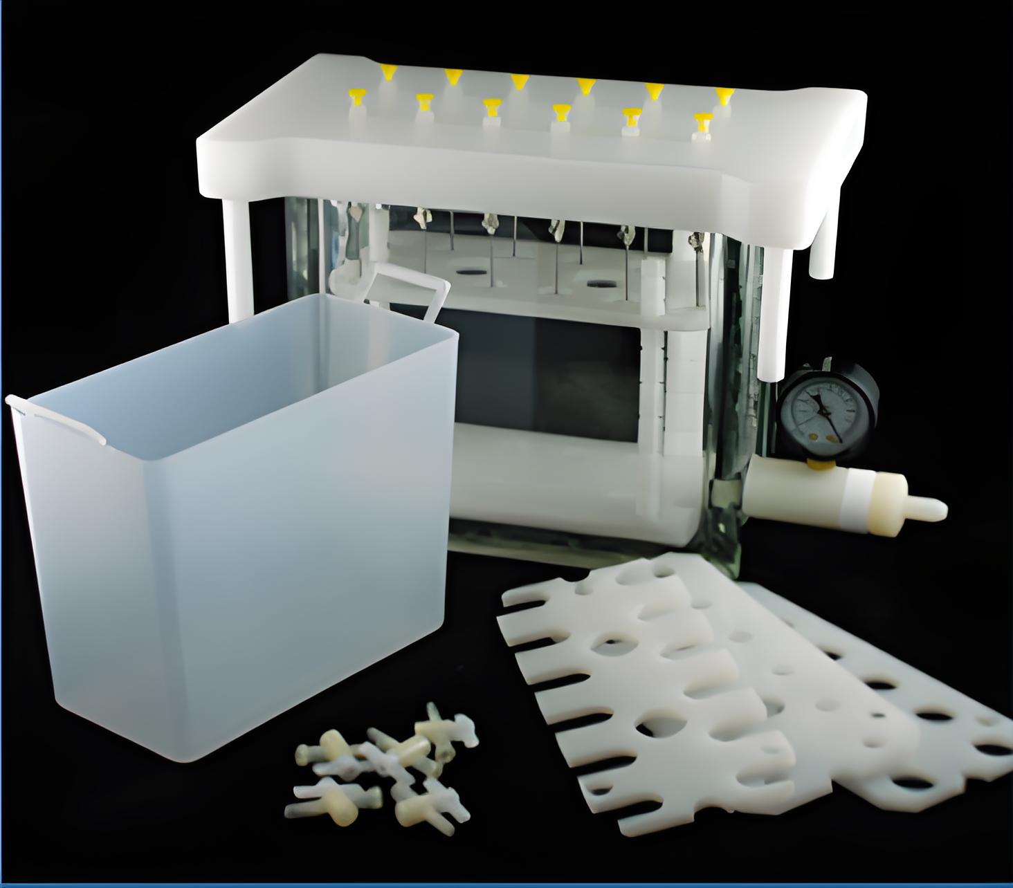 Mediwax固相萃取裝置可實現連續的樣品萃取和過濾,簡化復雜的樣品預處理過程并節約時間。整套裝置含有一個透明玻璃槽和頂蓋,可通過抽真空控制樣品流過SPE小柱實現萃取程序。通過調整玻璃槽里面的支架可容納不同規格的樣品收集管,包括玻璃或塑料試管、自動樣品瓶、容量瓶以及錐形瓶等,洗脫液通過選擇聚丙烯(PP)或不銹鋼導向針以及防交叉污染的特氟?。?/span>Teflon)連接管直接引入樣品收集管。12位裝置附贈一個聚丙烯(PP)廢液槽,用于操作中收集廢液,可簡化樣品處理過程中廢液的處理以及保持玻璃槽內潔凈的環境。